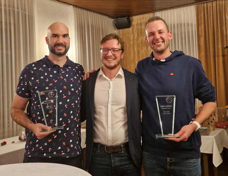 Für ihre Leistungen in der UBBC-Herrenmannschaft wurden Bernhard Staud (2009-2003) und Sebastian Senk (2011-2025) nach ihrem Rücktritt offiziell verabschiedet. Obmann Traxler überreichte beiden einen Glaspokal, in den mit ihren Eckdaten eingraviert wurden. Beide erzielten über 1000 Punkte für ihr Team und holten viele Rebounds unter den Körben.