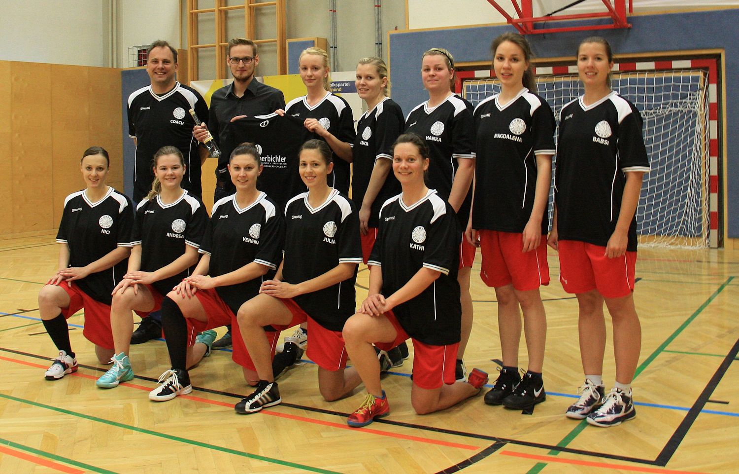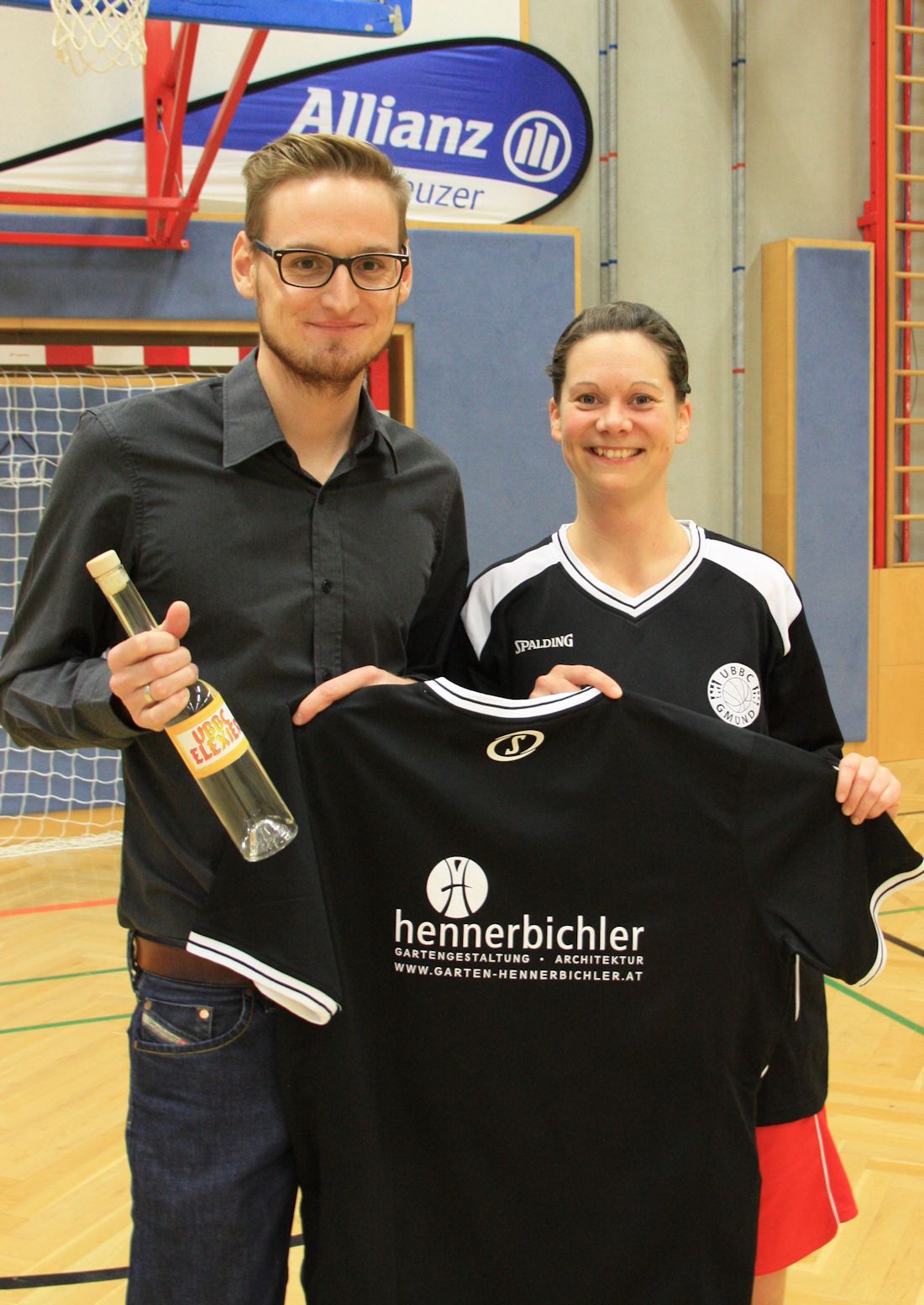 Gegen Dt. Wagram siegreich präsentierten die UBBC-Girls ihre neuen Shootingshirts - Kapitän Kathy Brezina bedankt sich bei bei Hr. Grudl Vertreter der Fa. Gartengestaltung Hennerbichler für die Dressspende.