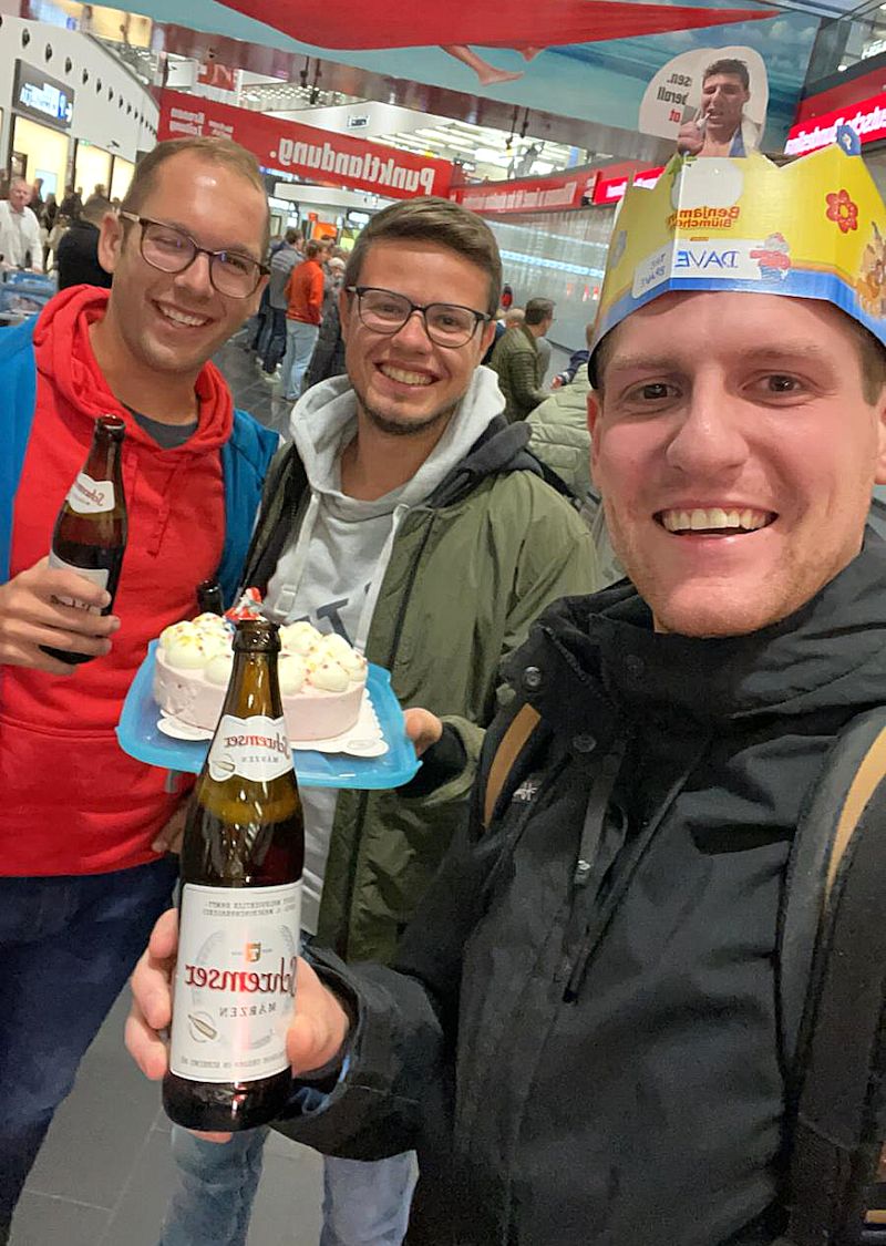 UBBC Herrenspieler David Graf konnte es nicht fassen, als er bei der Ankunft am Flughafen Schwechat von seinen Freunden mit Torte und Bier (natürlich ein Schremser) überrascht wurde.