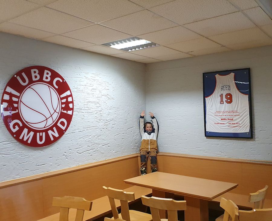 Das von dem Präsidenten des SKN St. Pölten überreichte Leiber von Willa Reed (Spieler aus dem Gründungsjahr des UBBC Gmünd in der NBA) wurde von Thomas Eigenschink würdig eingerahmt und fand ihren Platz im Bereich der UBBC Kantine in der Halle der NMS 1 Gmünd neben dem UBBC Logo.