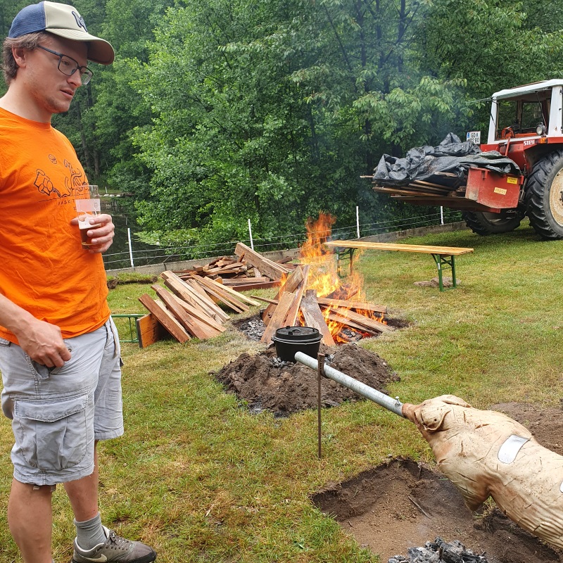 Um 9:15 Uhr war es so weite, die Sau war geholt und angerichtet, die erste Glut wärmte sie bereits. Auch das Gulasch für den Mittagshunger brodelte bereits auf der Glut. Obmann Traxler vom UBBC-TÜV nahm das Ganze ab.