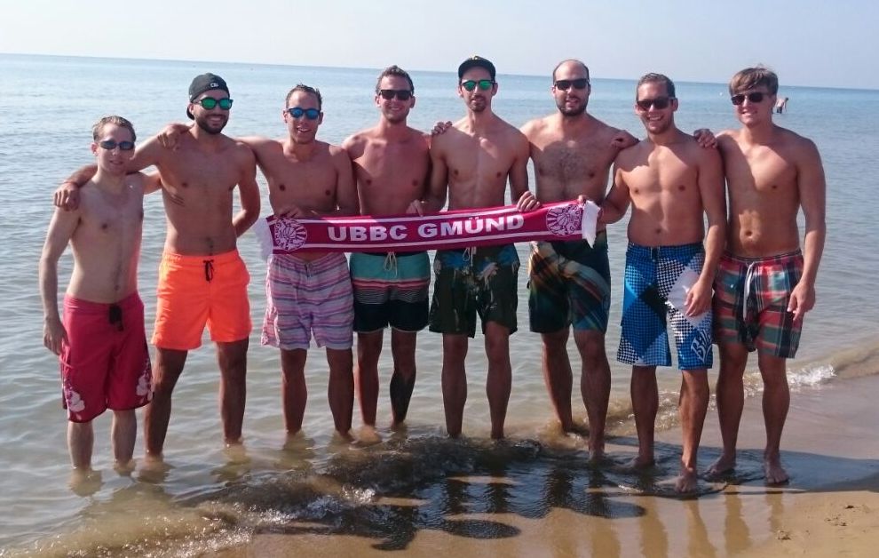 Die UBBC-Herrenmannschaft gönnt sich dem Trainingslager in Strakonice und nach hartem Training eine kleine gemeinsame Auszeit am "Hausmeisterstrand " in Bibione. Der UBBC Schal ist natürlich immer dabei.